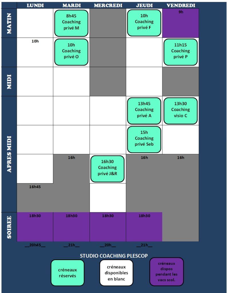 Ci contre l’agenda des séances de coaching, dans le studio à PLESCOP (56).